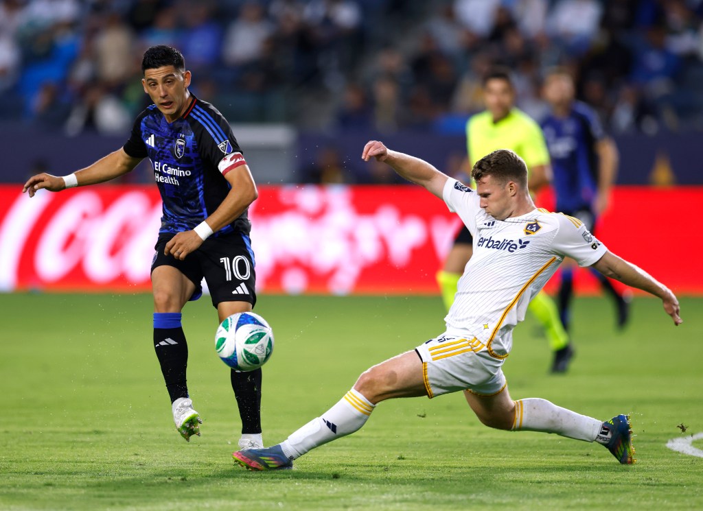 LA’s Novak Micovic had to make two diving saves in the first two minutes of play, and he finished with four saves in the scoreless first half. San Jose’s Ian Harkes hit the crossbar from long range in the 22nd minute.