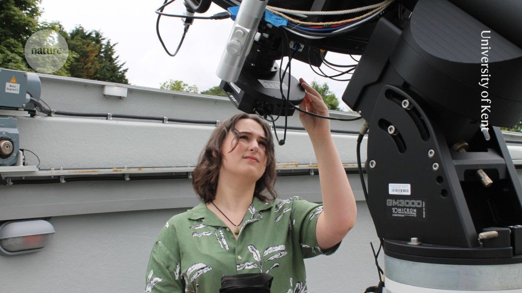 Carys Herbert inspects a telescope used in citizen-science projects at the University of Kent’s Beacon Observatory in Canterbury, UK — while she also scans the horizon for a permanent position after her PhD. Credit: University of Kent