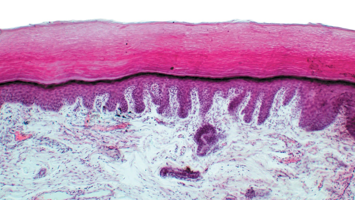 Epithelial cells from finger skin stained pink.