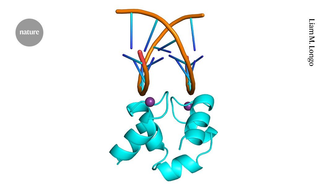 The ‘helix-hairpin-helix’ motif allows a peptide to bind to both DNA and its mirror image.Credit: Liam M. Longo