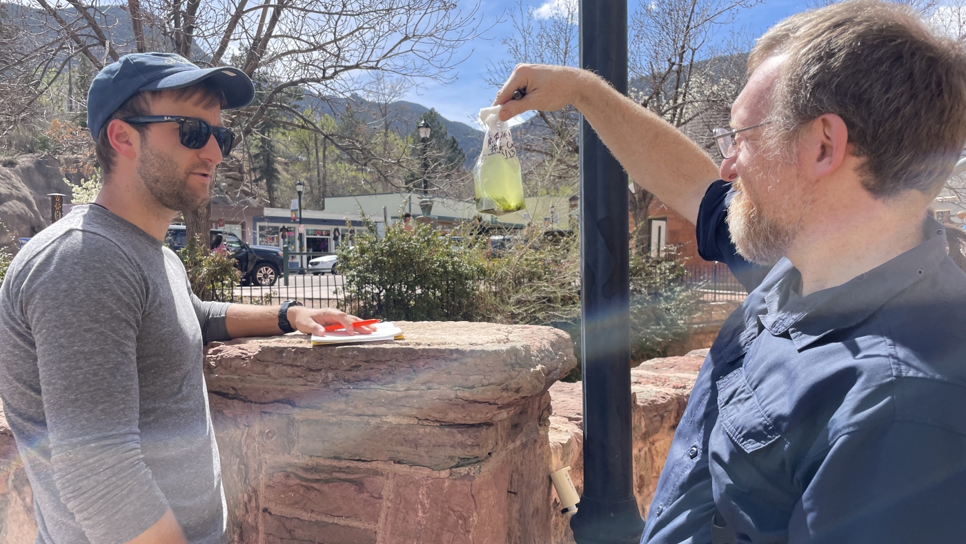 James Henriksen with Colorado State University, holds up a water sample for Harvard colleague Braden Tierney. The bag is teeming with microbes that they hope may help solve some of humanity’s big problems.